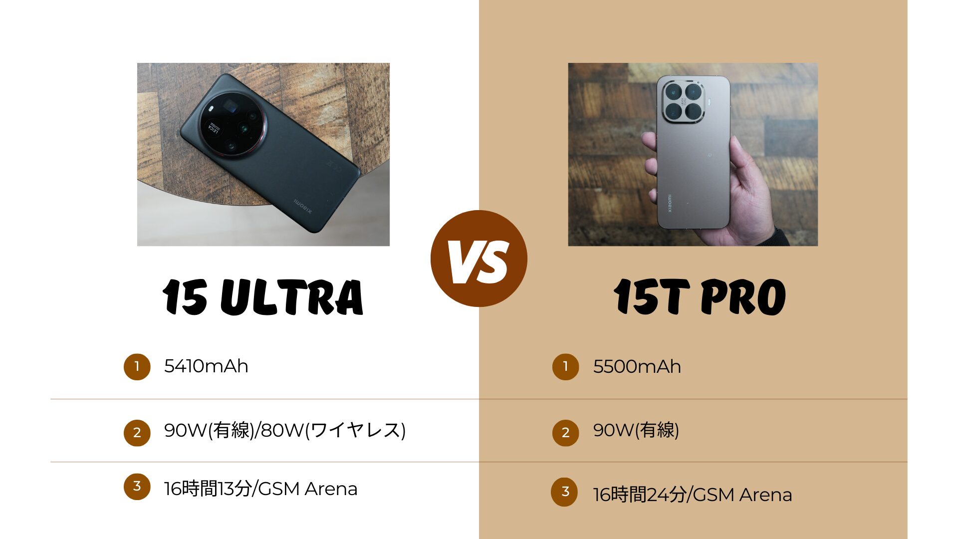 バッテリーに関してXiaomi 15 Ultraはグローバル展開する際のコストカットのためにバッテリー容量が減少しておりXiaomi 15T Proの方が僅かに容量が多いという感じです。