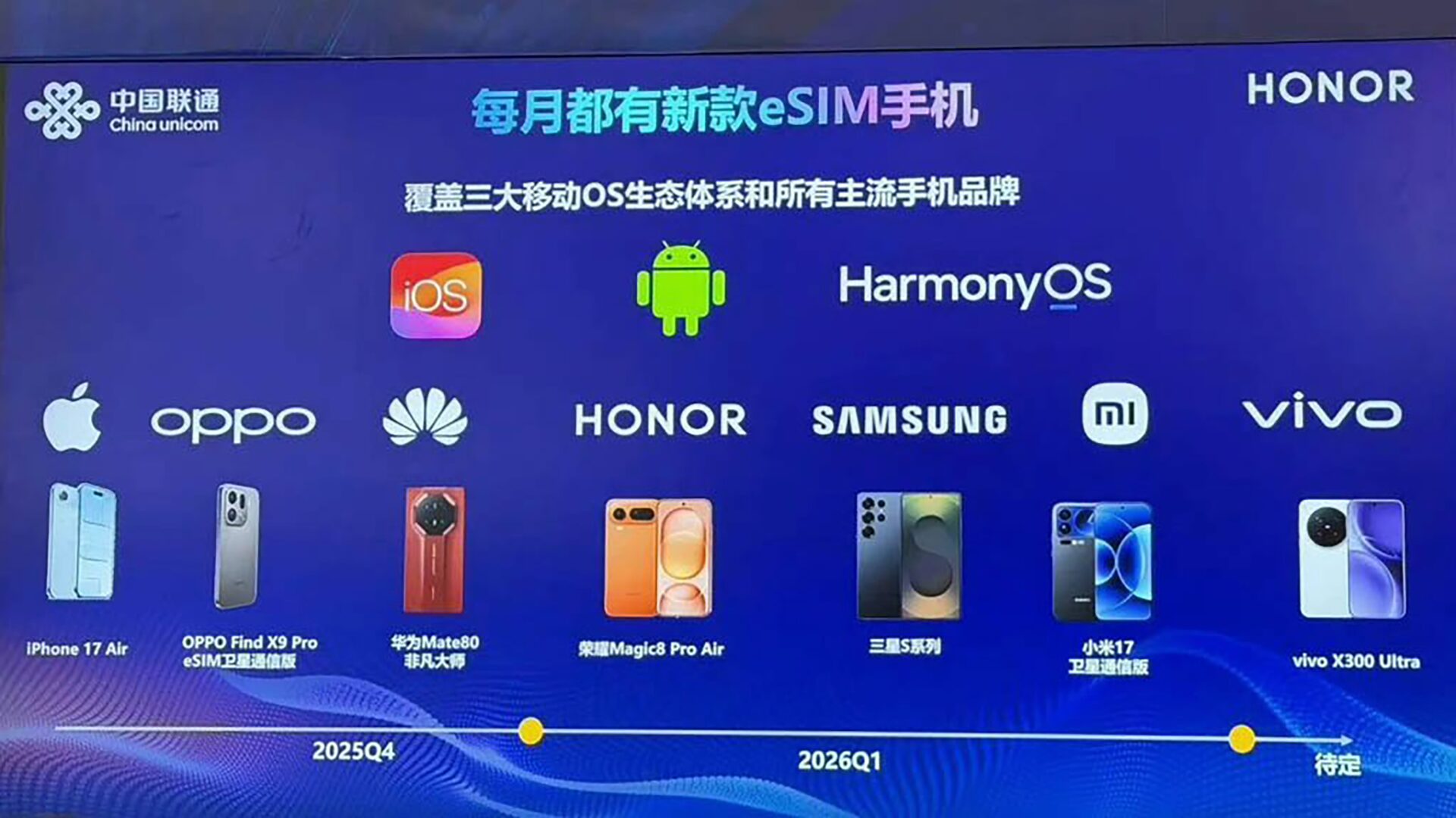 China Unicom announced that a new eSIM phone will be launched every month in 2026. The upcoming one counts Xiaomi and Samsung. eSIM phones will fully cover the three major mobile OS ecosystems and all mainstream mobile phone brands.https://t.co/FCeIAr4wG4 pic.twitter.com/AFeTbHpBlM