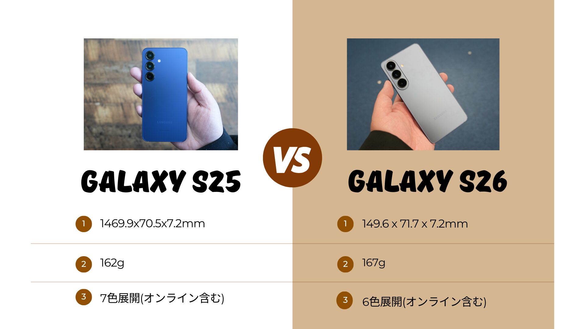 そして前モデルからデザインがどのように変更されたのか確認していきたいと思いますが筐体サイズに関してはGalaxy S26の方が僅かに大型化しており当たり前ですが重くなっています。