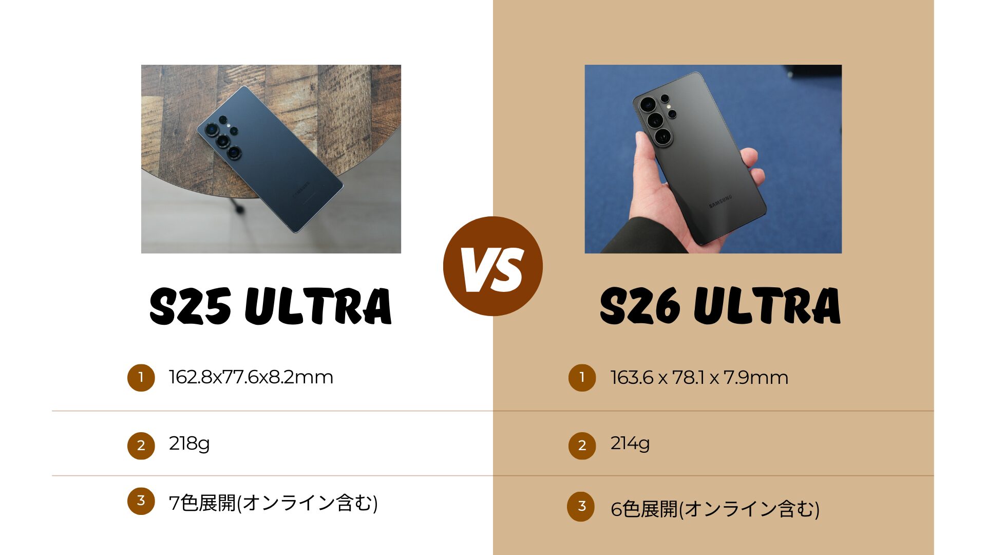そして前モデルからデザインがどのように変更されたのか確認していきたいと思いますが筐体サイズに関してはGalaxy S26 Ultraの方が僅かに大型化しており僅かに持ちにくく感じます。