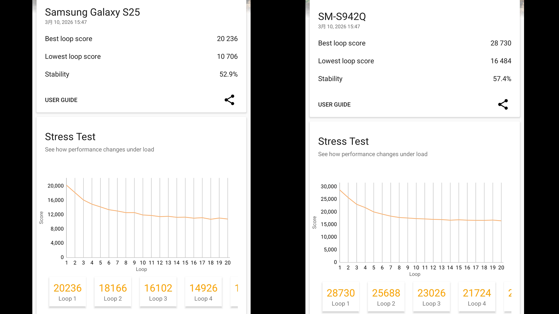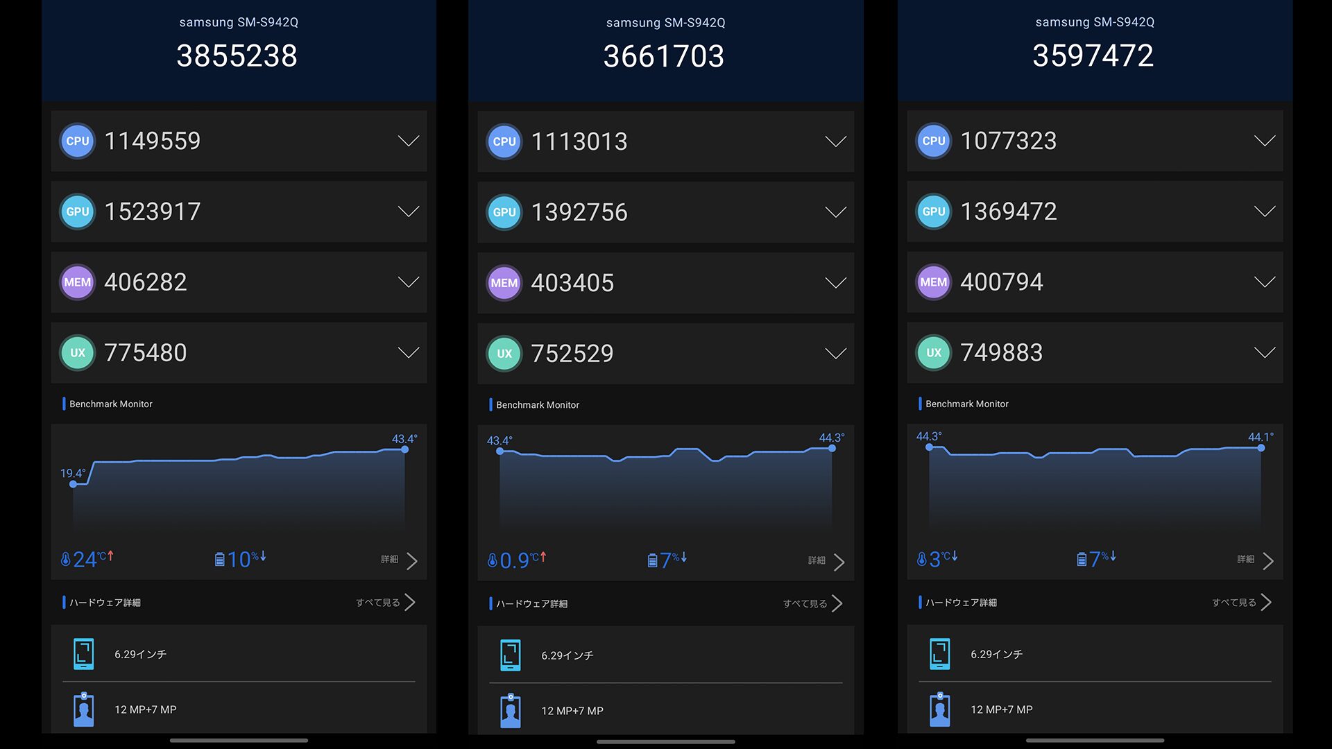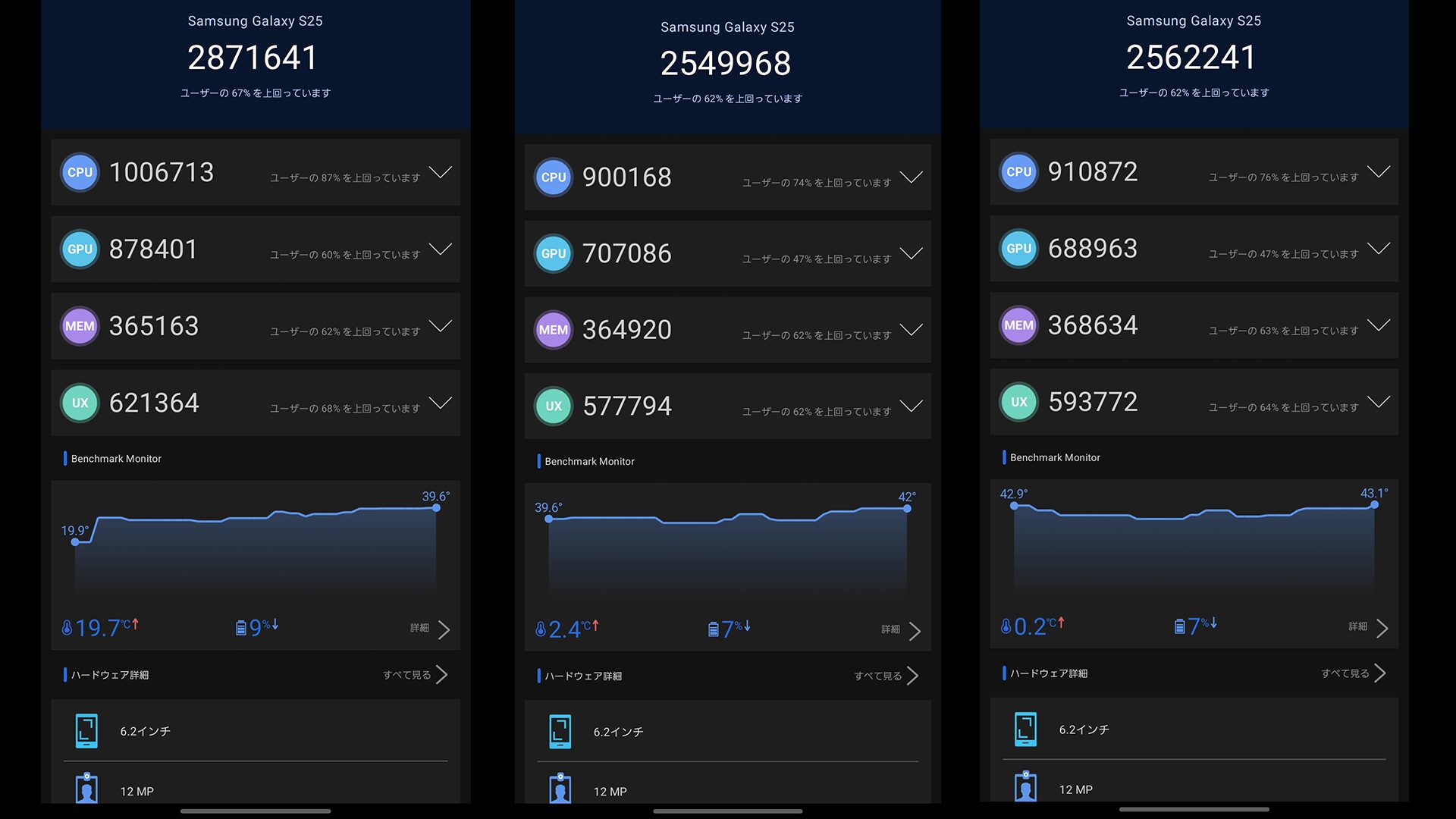 だからこそここまでのスコアが出ると思っておらず前モデルと比較しても雲泥の差です。また計測終了後とに外部温度を計測したところGalaxy S25は38.8/40.1/41.6度でGalaxy S26は40.1/41.0/42.6度とGalaxy S26の方が僅かに熱くなっている印象です。