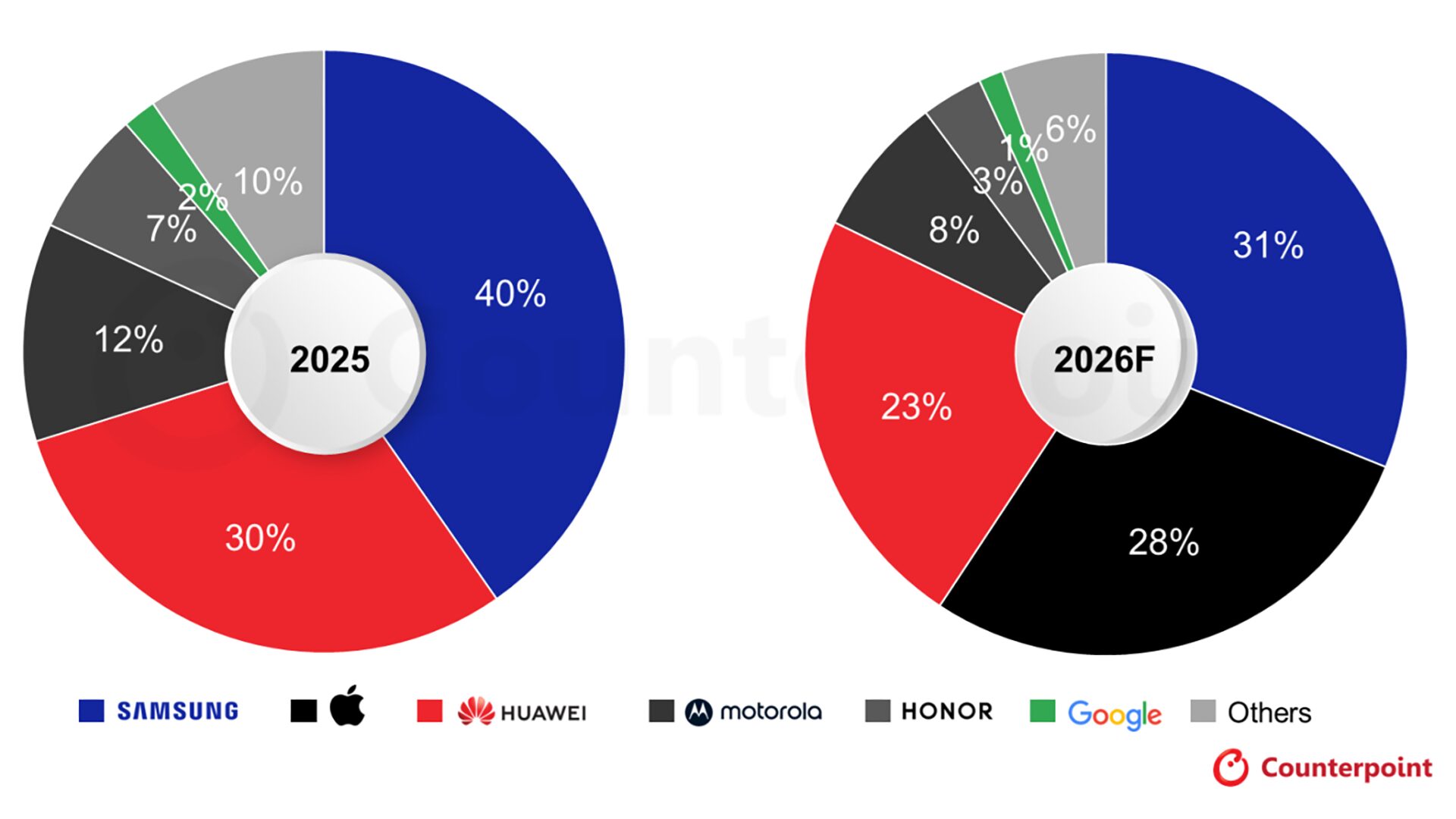 独立したカテゴリとして存在感を示している点は注目に値します。これは、米国で入手できる数少ない“ブック型”折りたたみ端末の一つであることや、ヨーロッパでの一定の成功が影響している可能性があります。具体的な数値は示されていませんが、CounterpointはGoogleが一定のユーザー層を確保しており、2026年になっても「その他」に分類されない程度の存在感を維持すると見ています。