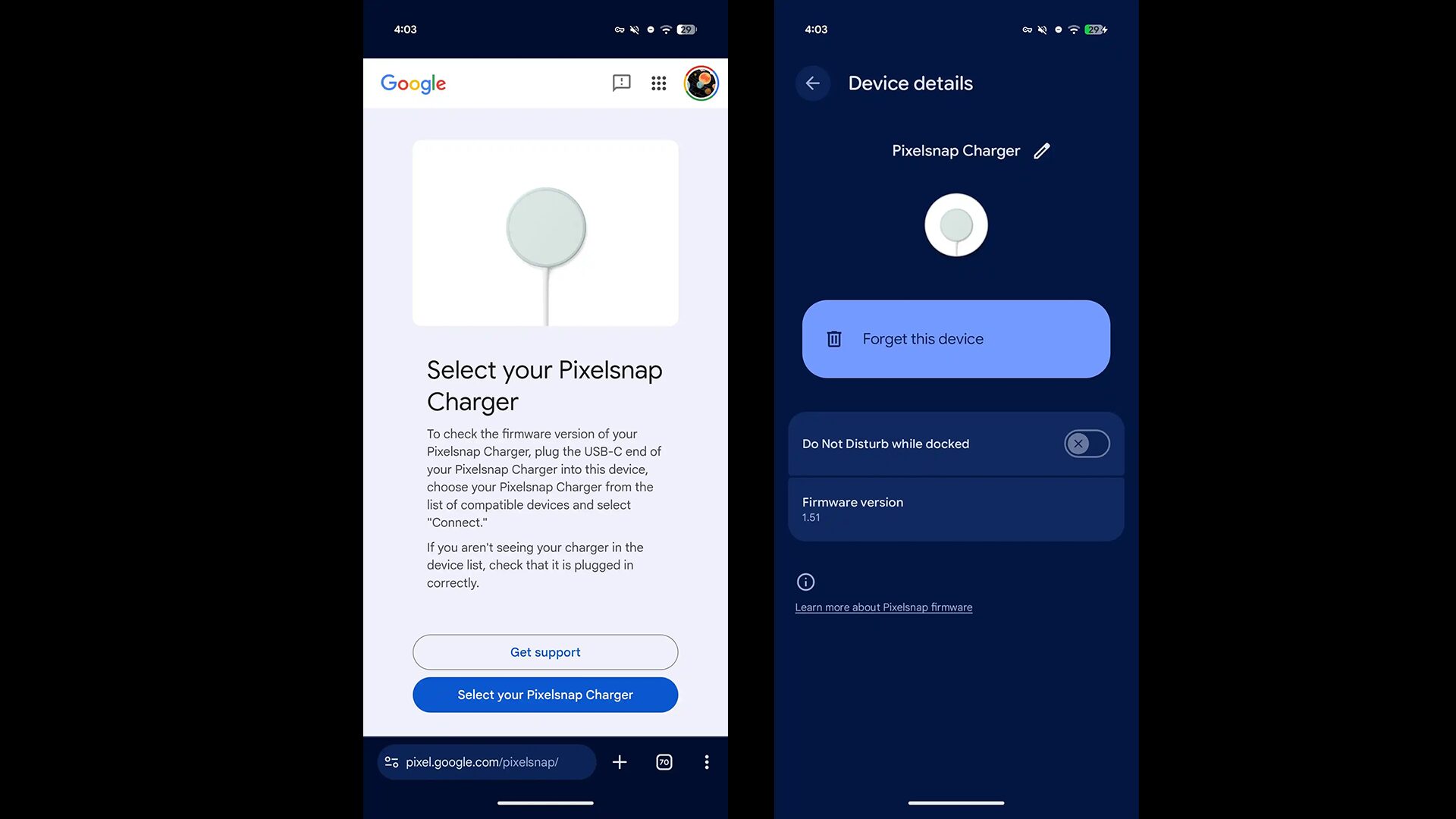 一方でPixel端末を使っていない場合でも、39.99ドルで購入したPixelsnap Chargerを持っていれば「手動アップデート」が可能です。この方法では、充電器のUSB-C端子をAndroid 16以上のスマートフォンに接続し、モバイル版のChromeで pixel.google.com/pixelsnap にアクセスします(デスクトップブラウザでは利用できません)。