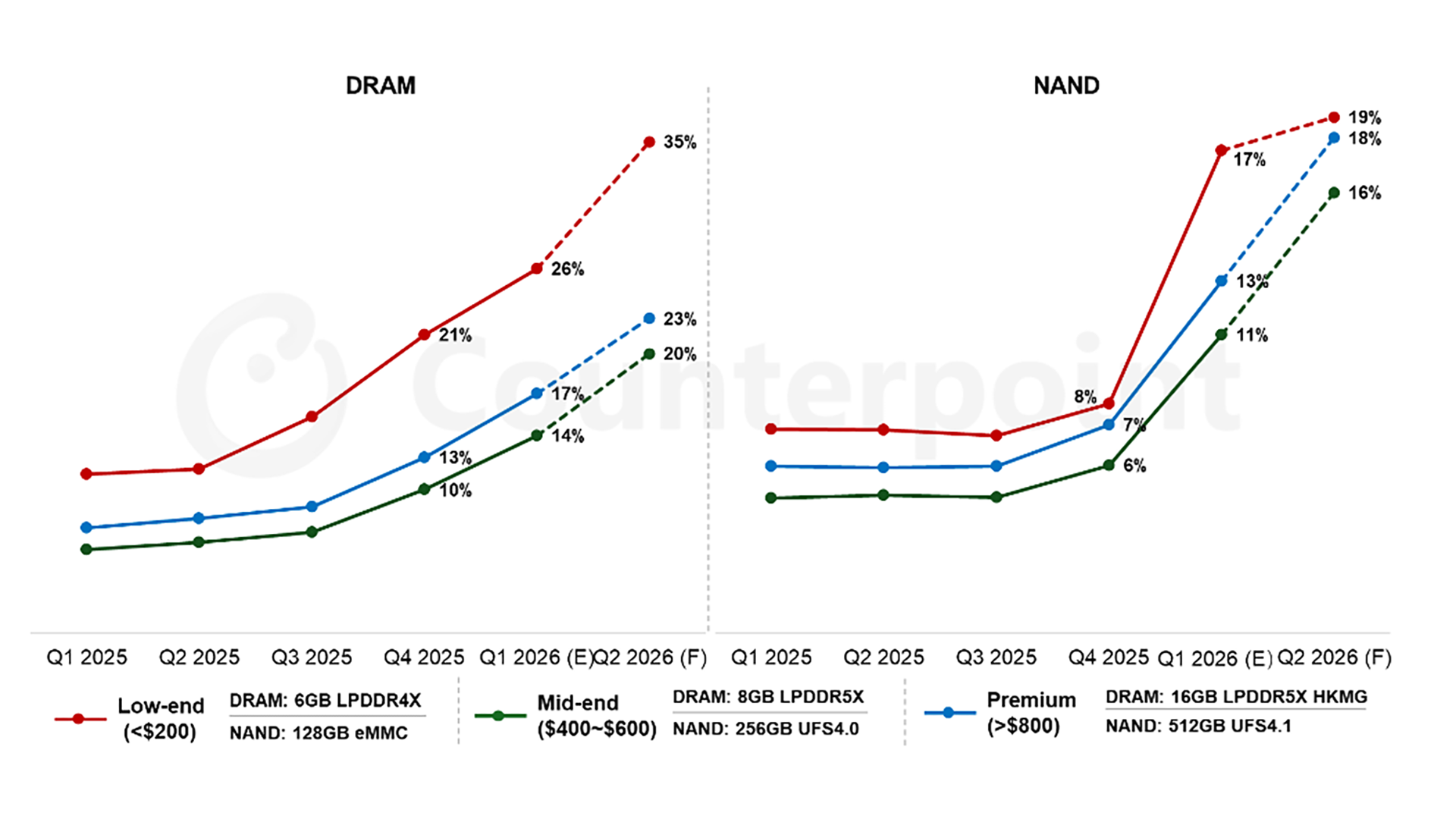 一方、800ドル以上のフラッグシップでも、2026年第2四半期にはBOMが100~150ドル増加する可能性があります。例えば、16GB LPDDR5X+512GB UFS 4.1構成では、それぞれ**23%と18%**を占めます。400~600ドルのミッドレンジも価格上昇は避けられませんが、影響は比較的小さいとされています。8GB LPDDR5X+256GB UFS 4.0構成では、それぞれ**20%と16%**を占めます。