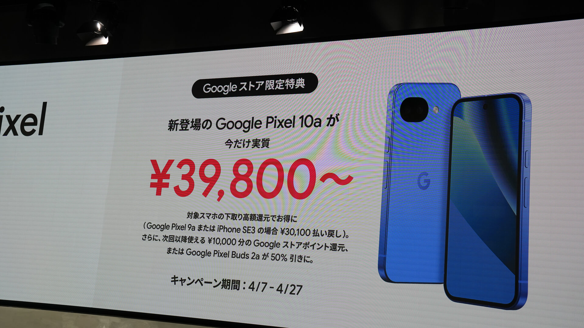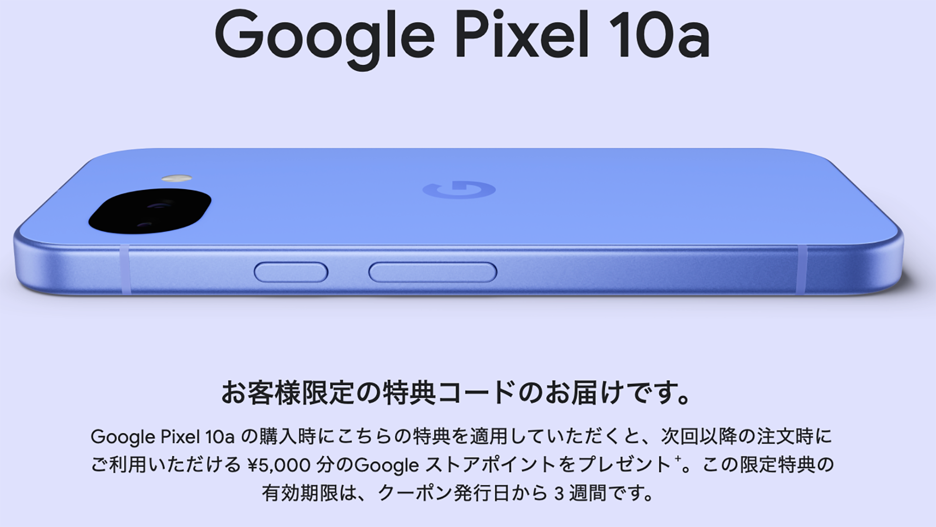 またGoogle Storeにおいて購入特典として1万円分のストアクレジットがもらえる上にPixel 9aを下取りに出して最大条件を満たすことで実質3万9800円で購入することが可能です。