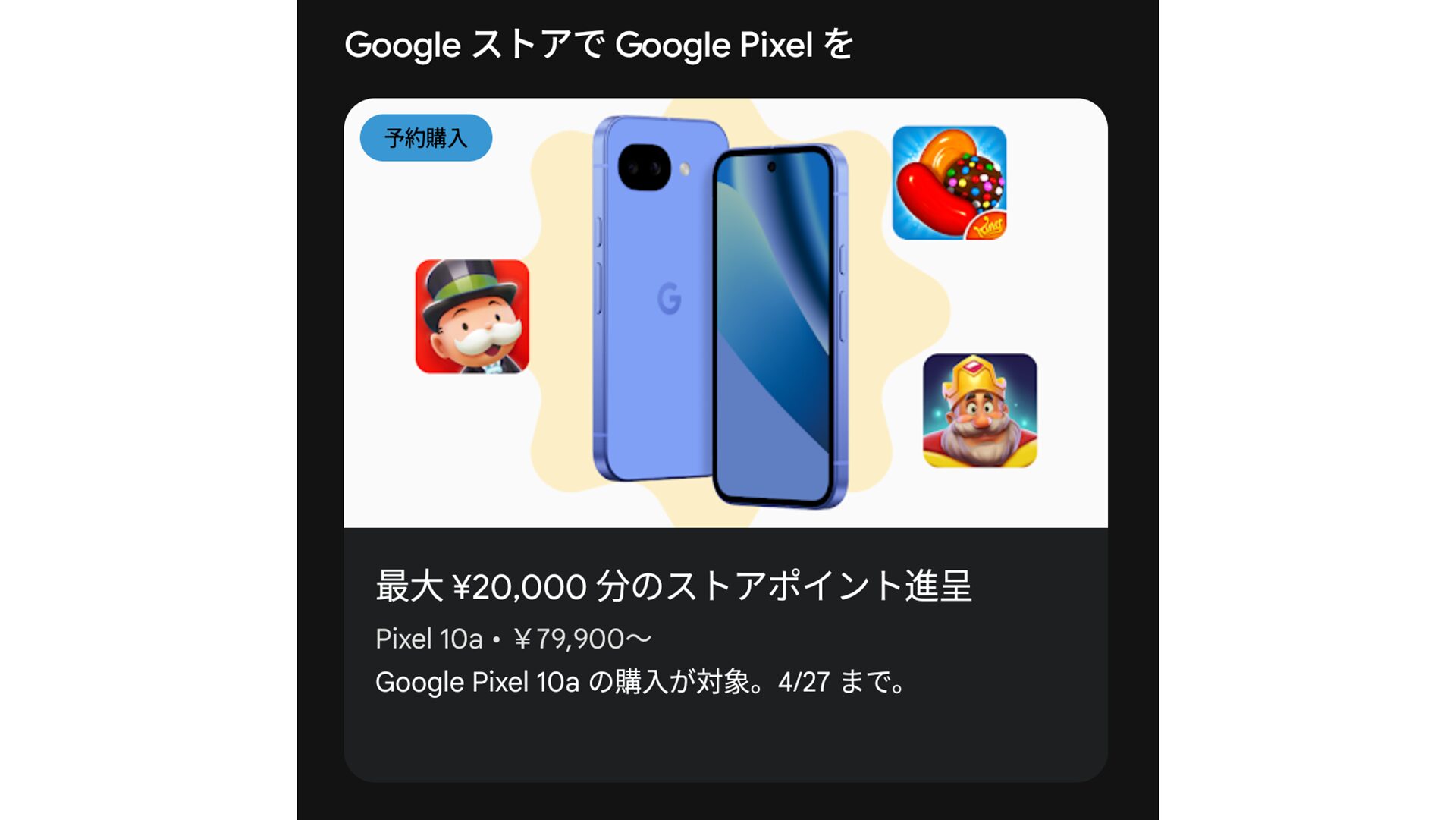 今回Google Play StoreにおいてGoogle Pixel 10aの購入でもらえるストアポイントが配布されていることが判明しました。残念なことに全てのユーザーが表示されているのか不明で、使用方法としてはタップするだけですが。