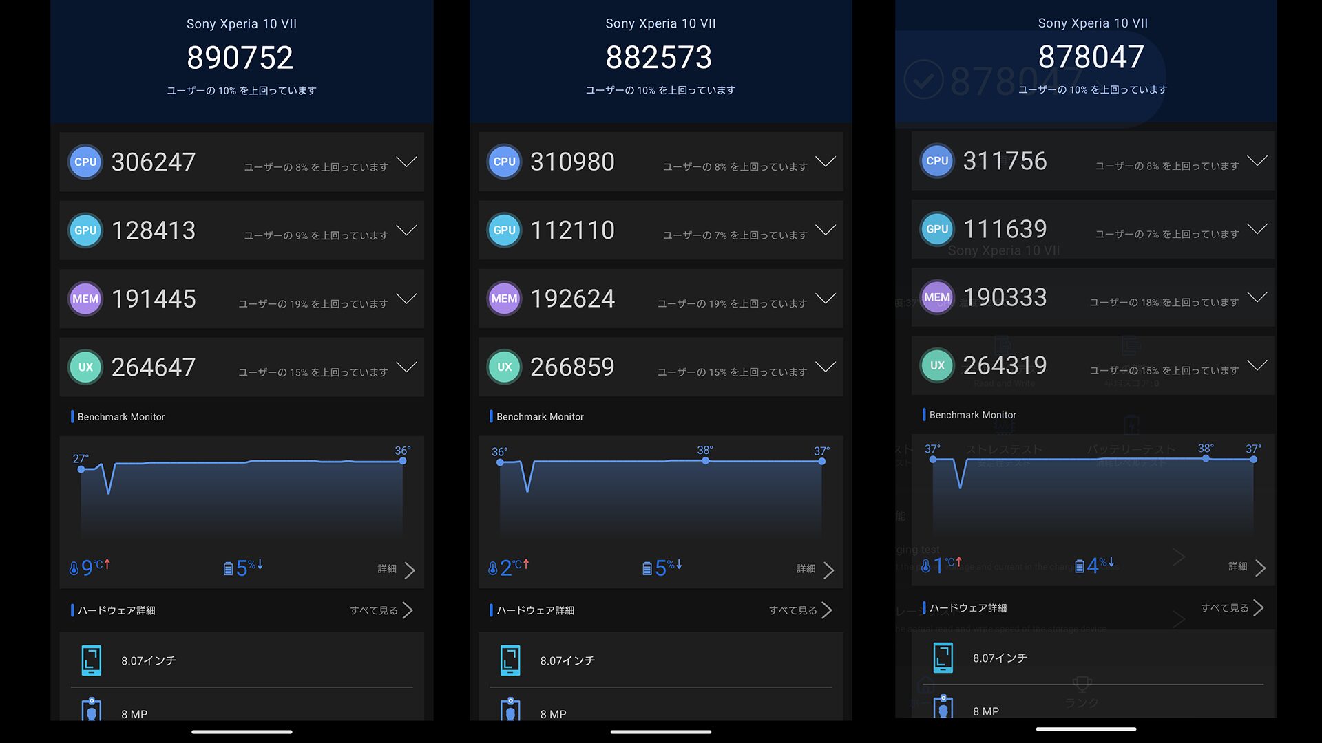 SDカードに全てのデータが保存できるわけでもなく処理速度の問題もあるので評価が分かれます。そして発熱の程度を調べるためにペンチマークを3回連続で回して負荷をかけてみました。