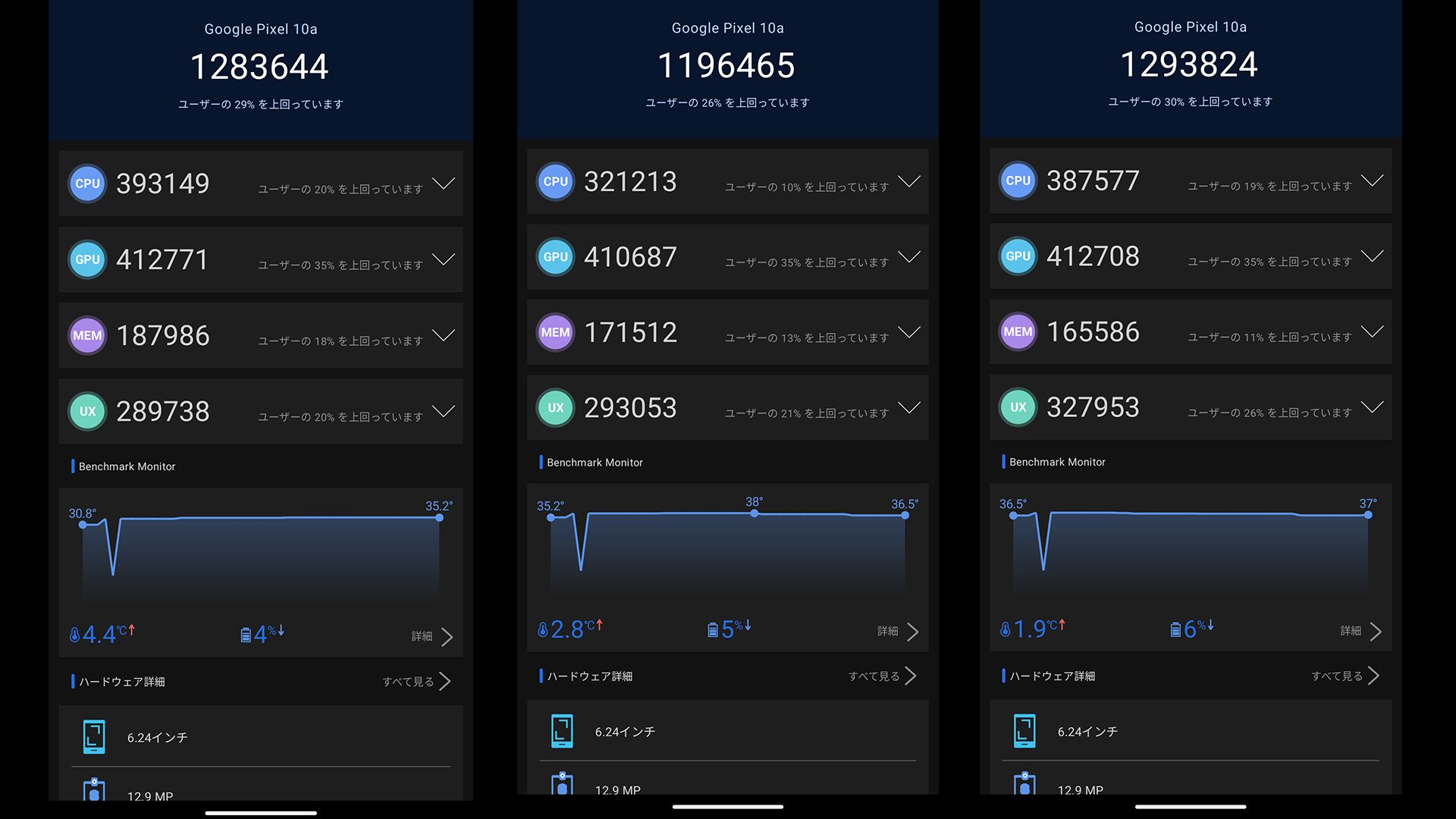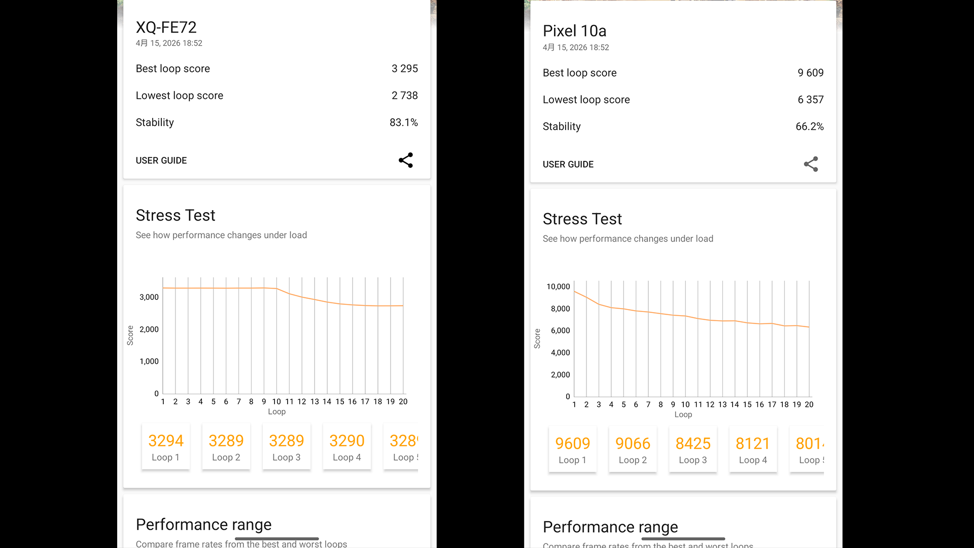トップスコアにかなりの差があるということもありますがXperia 10Ⅶの方が安定率が高い感じでさらに計測終了後に外部温度を計測してみるとXperia 10Ⅶは34.8度に対してPixel 10aは41.4度と20分の計測で発熱の仕方に大きな違いが出たという印象を受けます。